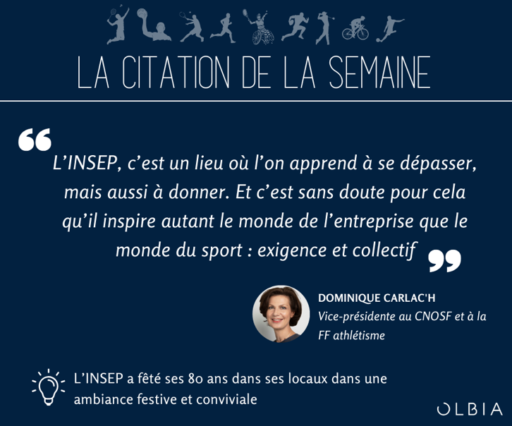 L’INSEP a célébré son 80° anniversaire autour d’une cérémonie avec de nombreux champions passés par l’institut // Alpes françaises 2030 a lancé un appel d’offres pour la conception des emblèmes et du territoire visuel des Jeux // La Commission européenne a organisé la semaine internationale du sport // L’AFD a publié son bilan d’activité sport et développement // Le PRNSI a publié son bulletin de veille de ces trois dernières semaines. Il a aussi lancé l’actualisation de la page d’accueil de son outil Data ES // Le comité d’organisation Haute-Savoie Mont-Blanc 2027 a lancé un marché de courtage en sponsoring // Une nouvelle revue Jurisport a été publiée sur les chiffres clés du sport professionnel // Le think tank Sport & Citoyenneté a publié un livre blanc sur l’héritage des Jeux de Paris 2024 // L’AFLD a conclu un partenariat avec le Festival Hoka les Templiers avec pour objectif de sensibiliser et lutter contre le dopage // L’ANDES a réuni ses référents départementaux du Calvados et ses élus locaux pour revenir sur l’héritage des JOP 2024 et pour célébrer la 100° adhésion à l’ANDES // Les Essentielles du sport, un réseau de femmes dirigeantes et expertes dans l’écosystème du sport, ont annoncé le lancement de la 1° édition de leur programme de mentorat //